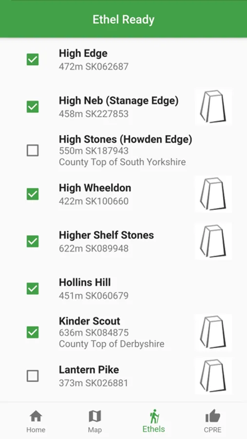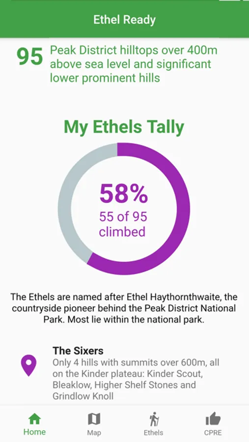Named after Ethel Haythornthwaite (the pioneer behind the Peak District National Park), the Ethels are all of the Peak District hills over 400m above sea level and significant lower prominent hills. Fewer, lower, easier and (for most of the UK's population) closer than the Munros of Scotland and the Wainwrights of the Lake District.
