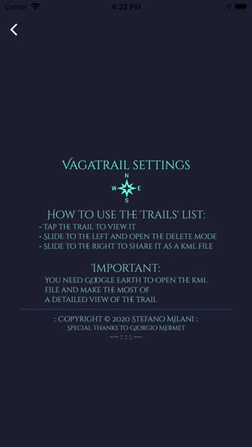 Vagabondo richiede l'abilitazione dei permessi per la localizzazione, l'accesso ai file per il salvataggio, l'accesso ai contatti per la condivisione ed altri permessi necessari al suo funzionamento che salvaguardano la privacy e la sicurezza del suo utilizzatore nel pieno rispetto delle normative richieste in tal senso. Importante: per un corretto tracciamento in background abilitare i permessi all'app selezionando "Always allow" in Location settings.