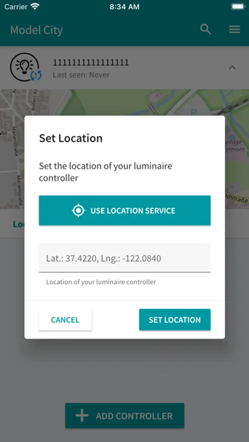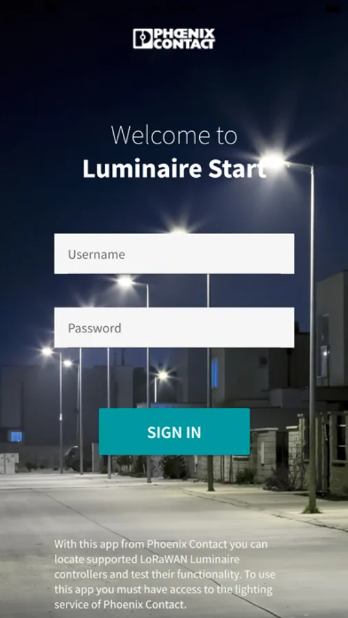 With this app from Phoenix Contact you can locate supported LPWAN Luminaire Controllers and test their functionality. To use this app you must have access to the lighting service of Phoenix Contact.