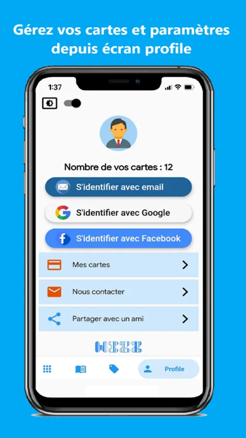 En vous identifiant dans la rubrique profile toutes vos cartes ajoutées seront stockées dans nos serveurs et comme ça vous pouvez à tout moment les récupérer si vous changez de smartphone ou réinstallez l’application de nouveau.