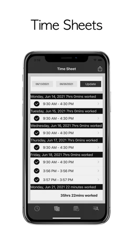 You can quickly print out your employees timesheets and share with your accountant or employee. Or you can email it directly to them. We added the same functionality for schedules, your employee can view their schedules or the entire team's schedules. If you need to export your employees timesheet in .csv format you can do so with a tap of a button.