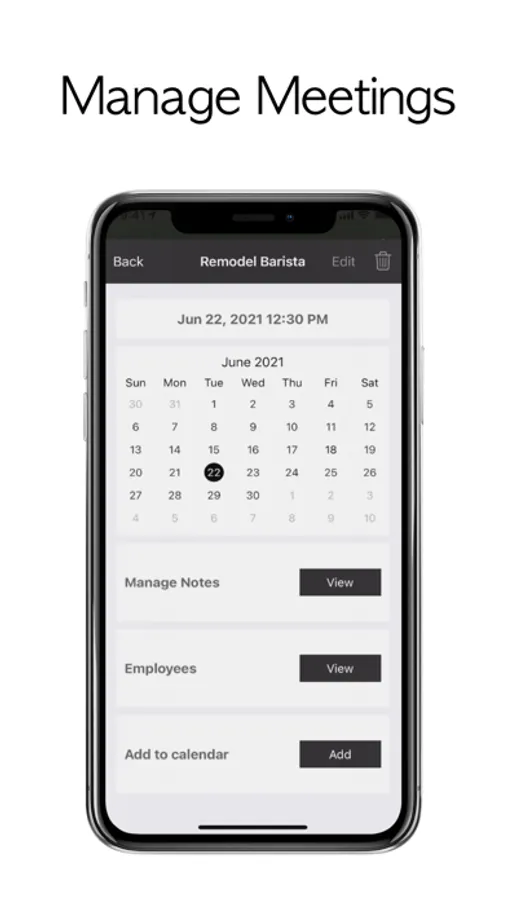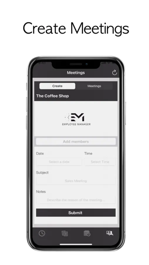 Create meetings with ease and add as many employees needed to be part of the meeting. You can add notes and even add the meeting to your calendar for reminders.