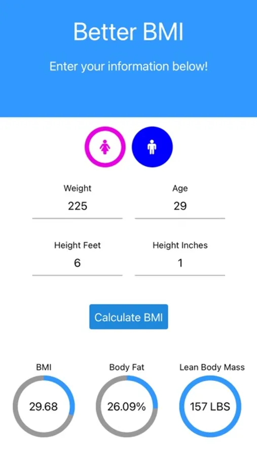A better way to measure your BMI! Stay healthy with a clean & simple UI! Get your BMI, body fat percentage, and lean body mass! Completely ad free always!