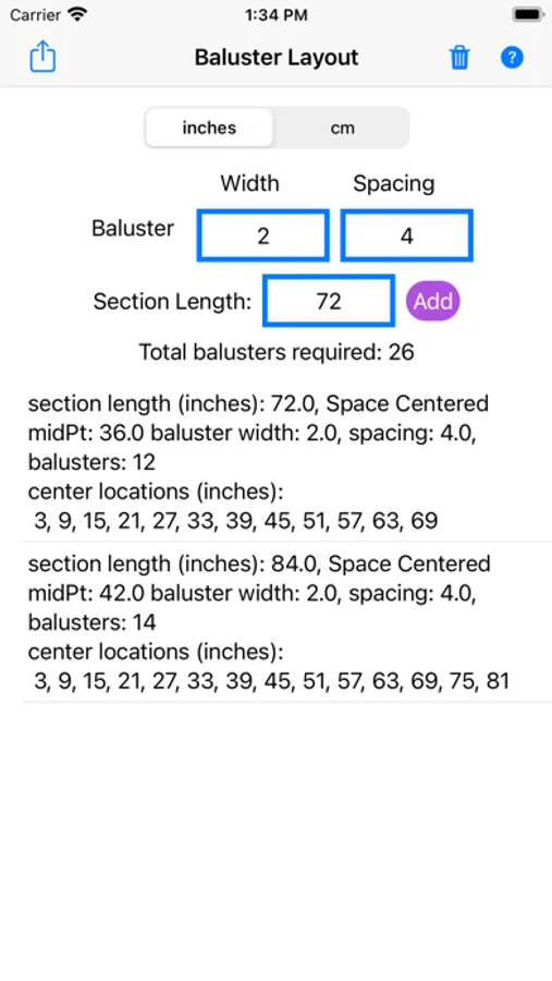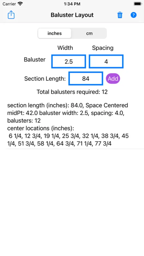 The results will show how many balusters are needed for each section and the location that each baluster should be attached to meet the proper spacing.