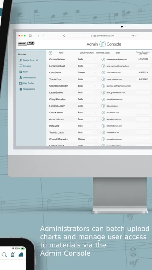 Batch upload lists of users. Delegate a main instrument to musicians. Send introduction emails to musicians where they can click a link and easily download all of their music.