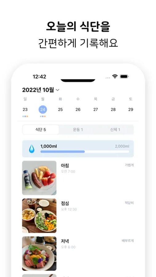 오늘 먹은 식단 사진과 식사량을 기록해보세요. 기록한 식단을 바탕으로 계획한 식단을 잘 지키고 있는지, 개선할 식단이 있는지 파악하고 올바른 방향으로 식단을 진행하세요.