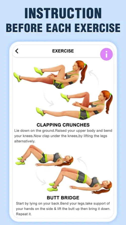 • Fitness app workouts targets main areas like chest, belly, butt, abs etc…