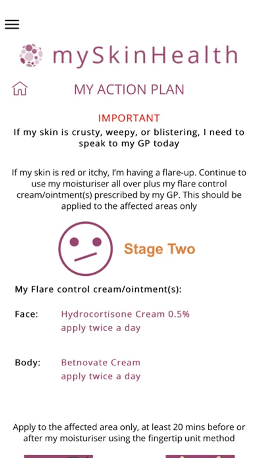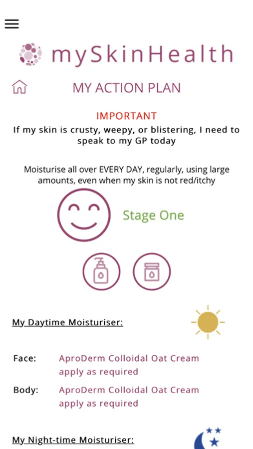 • Your personalised written action plan is your ‘road map’ to improving and managing your eczema and is based on what you tell the app about the treatments that you use