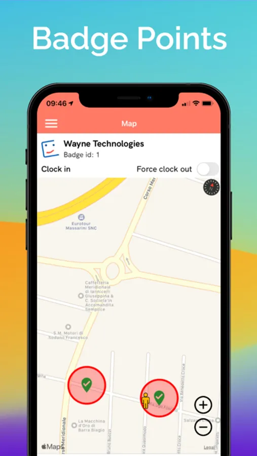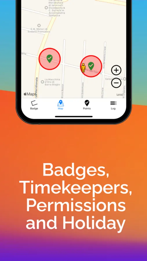 Application has also a map view showing virtual badge points range so to simplify badge actions.