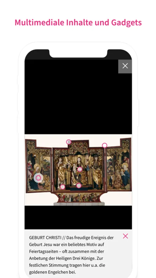 - Multimedia gadgets: pictures, 360° panoramas, videos, audio, animations, hidden details such as X-rays and reverse sides, selfie filter, quizzes and more