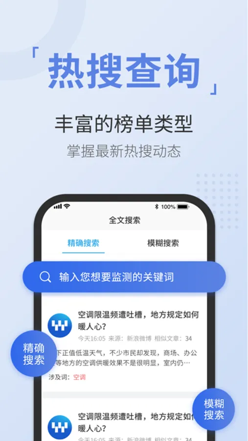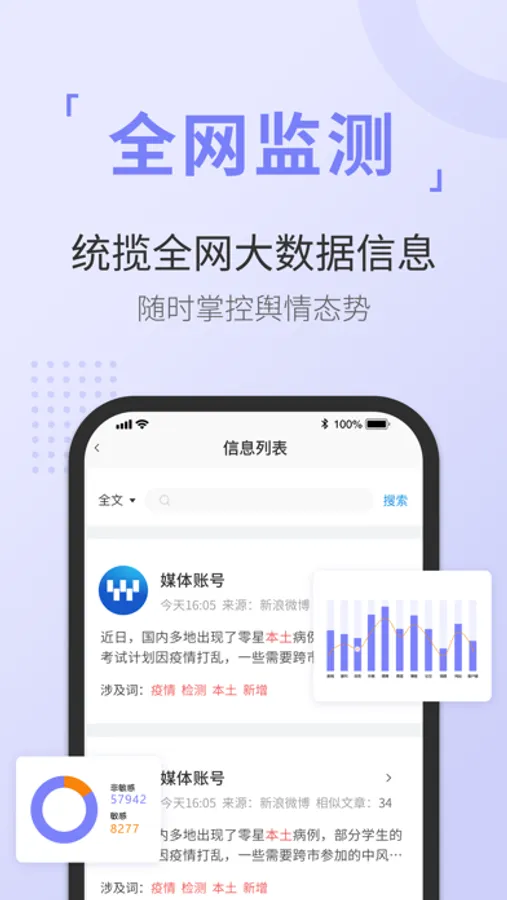 无忧舆情以中文互联网大数据及新浪微博的官方数据为基础,7*24小时不间断采集全网舆情信息。并通过深度数据挖掘与智能语义分析,辅助用户从海量数据中提取公众态度、分析事件态势、聆听用户反馈。通过近十年的行业积累,无忧舆情面向用户提供专业的信息监测、舆情预警、全网事件分析、微博事件分析、微博传播效果分析、竞品分析、热搜榜单、定制简报、大屏指挥系统等在内的全方位舆情服务,助力用户科学的应对舆情事件。