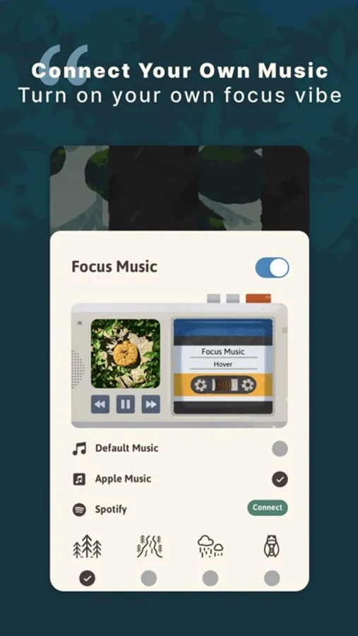 - Connect to Apple Music to play your own personal focus music.