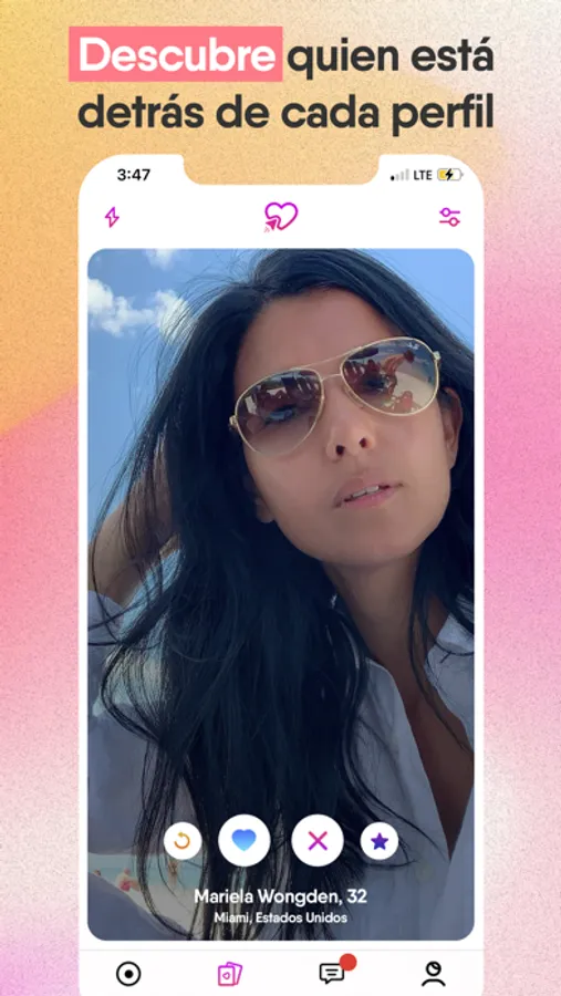 - Encuentros: Desliza a la derecha si te gusta y a la izquierda para ver el siguiente perfil.