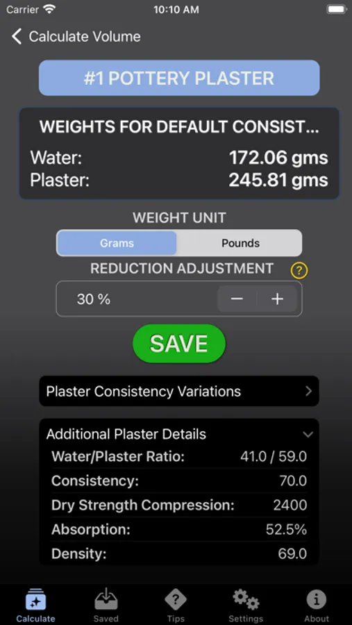 Allows measurement of plaster and water in pounds/ounces or grams, the default can be changed in the Settings.