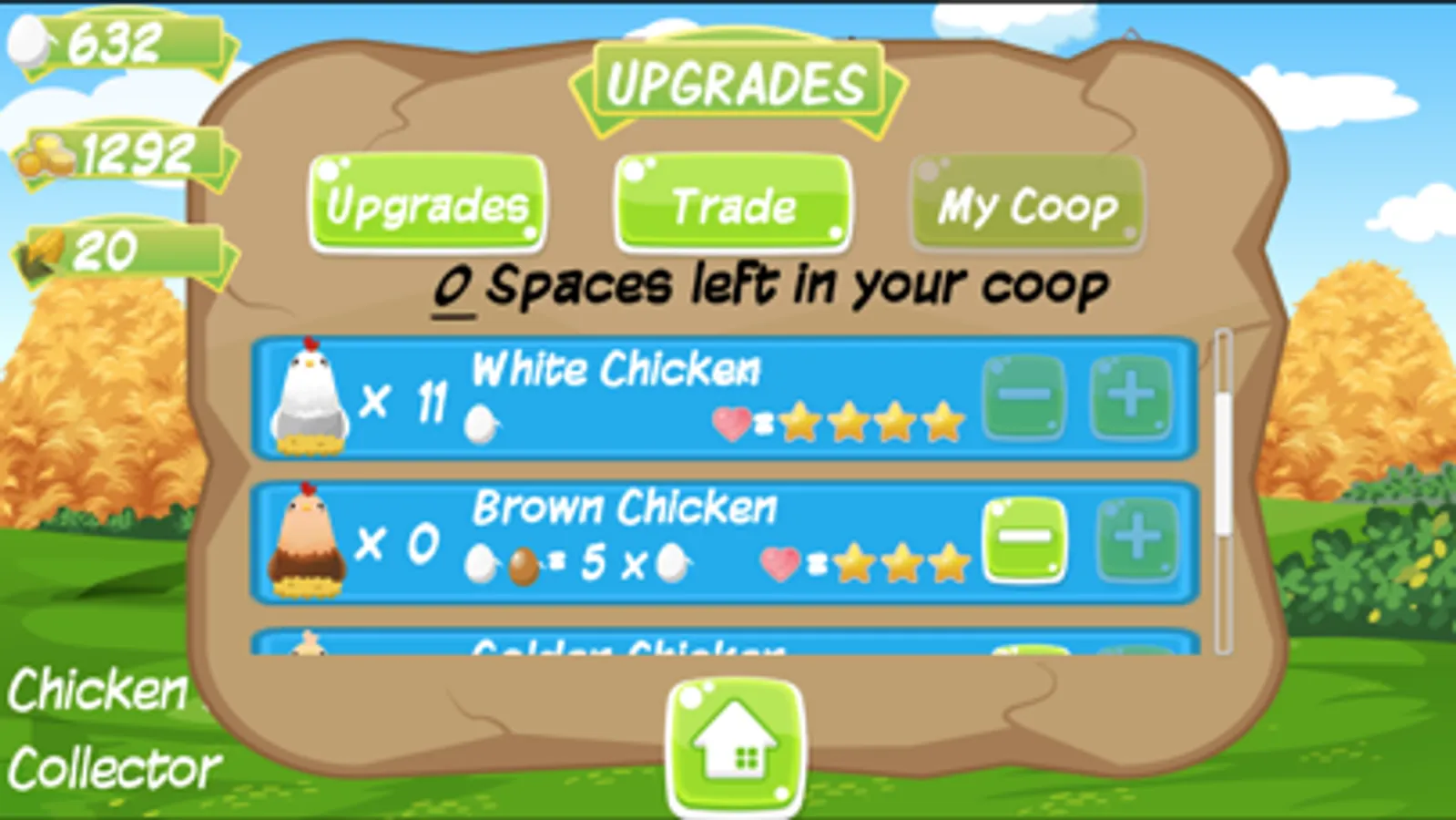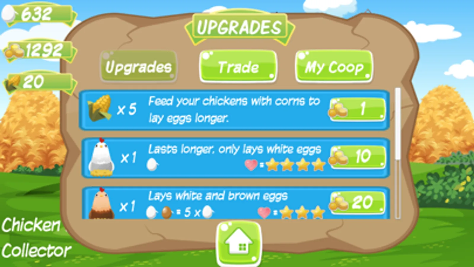 Do not forget to feed your chickens with corns. Trade your eggs with coins to buy more chickens.