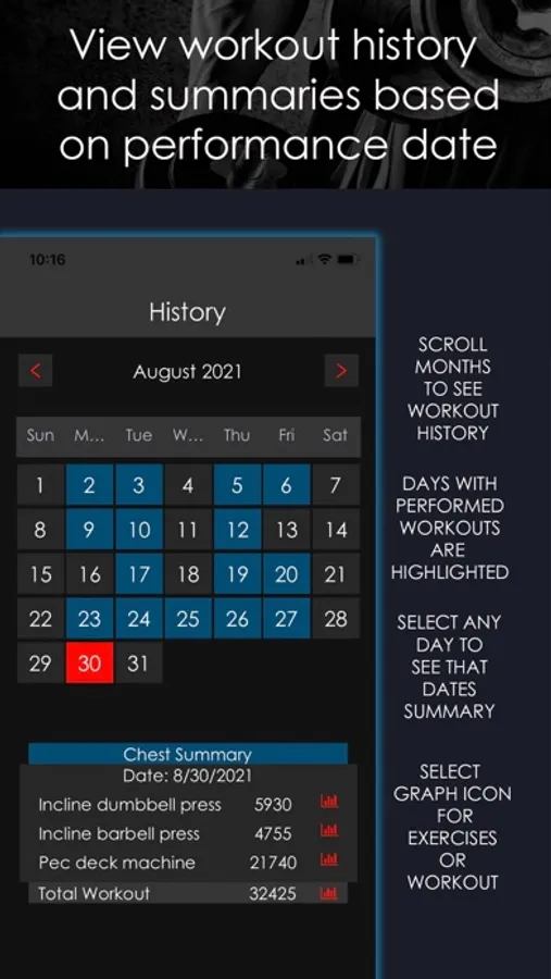 History calendar displays highlighted dates of recorded workouts allowing selection and review of any specific day’s workout and recorded workout volumes.