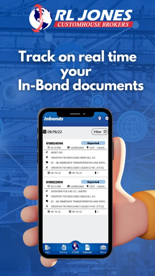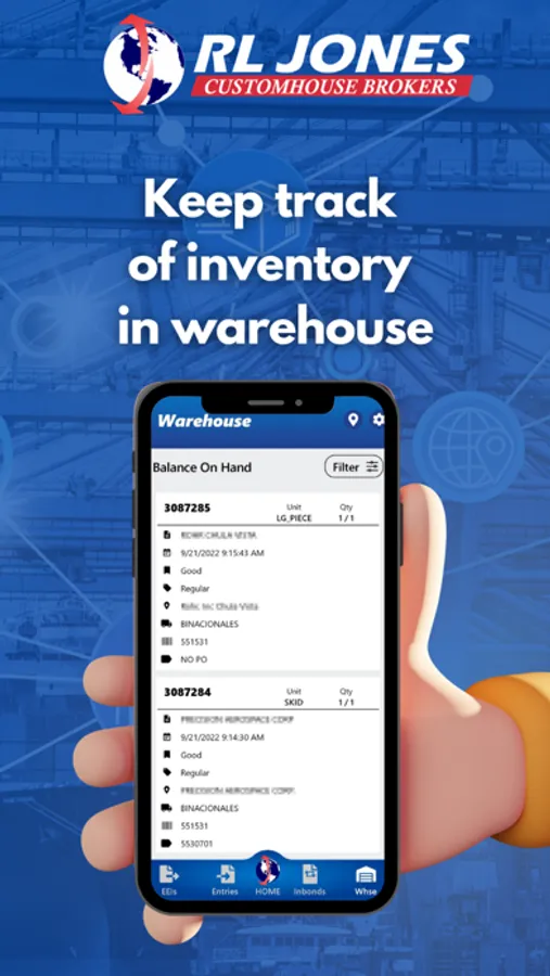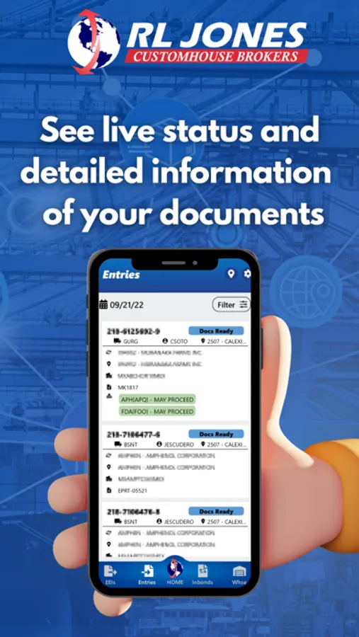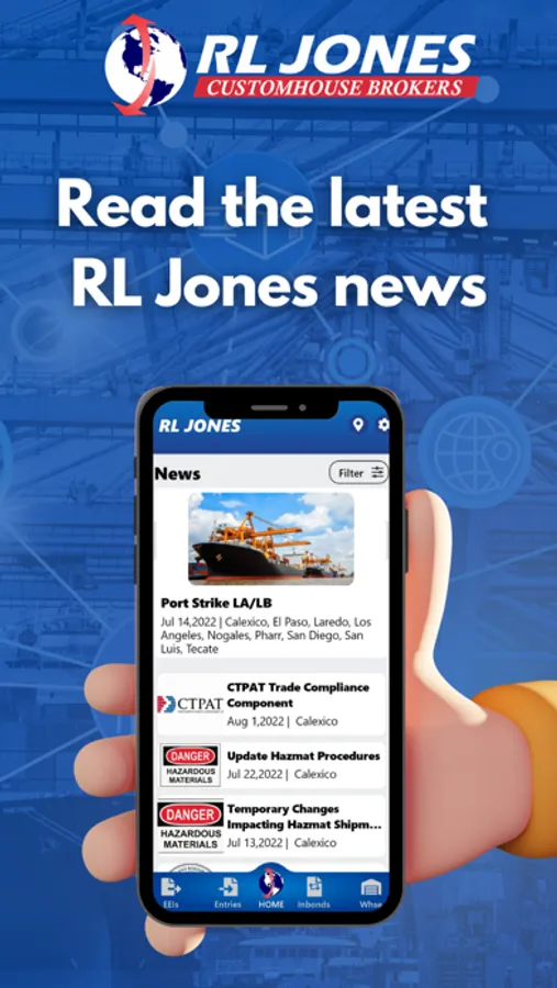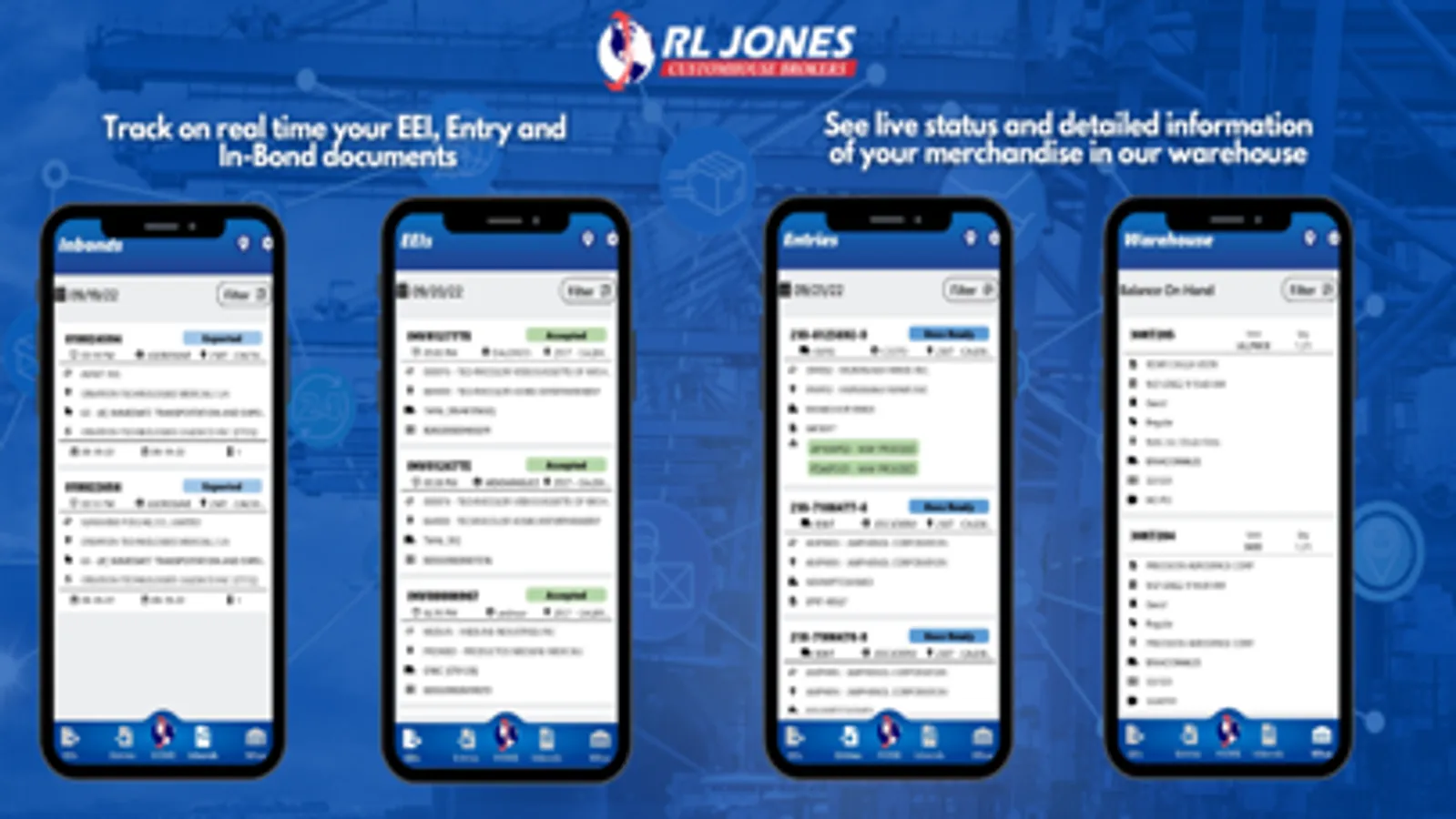 Track your EEI, Entry and In-Bond documents, your merchandise in our warehouses from you cell phone. See live status and detailed information of your documents , read the latest RL Jones news, find RL Jones locations and detailed information about our services.