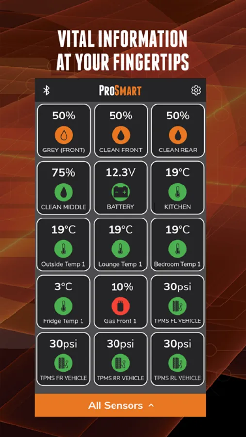 Monitor water levels in your fresh or grey water tanks, gas levels in your BBQ / propane bottles, tyre pressure (TPMS), temperatures in the fridge, freezer or inside your vehicle, as well as your 12V battery charge, all from an easy-to-use app on your smartphone.