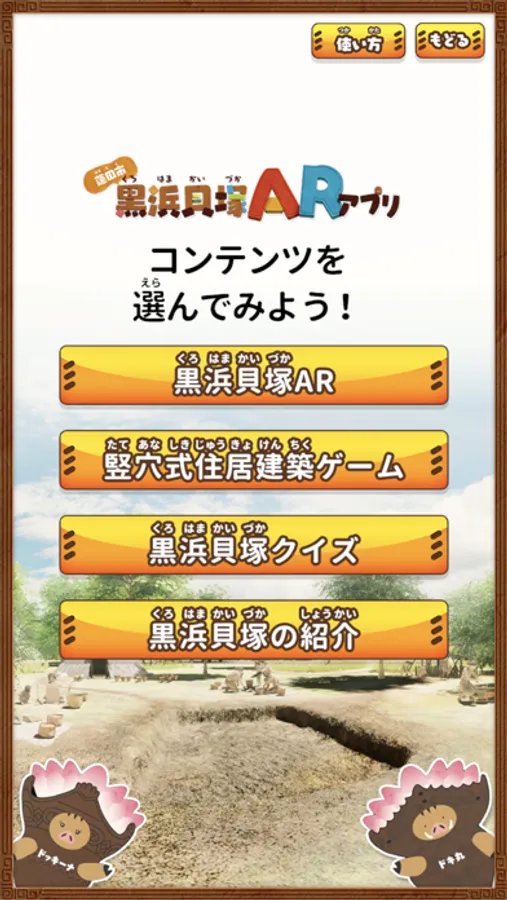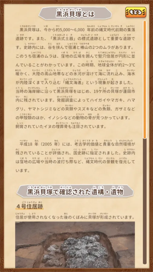 本アプリは埼玉県蓮田市黒浜にある国指定史跡「黒浜貝塚」内をARやVRの技術を使って黒浜貝塚の変遷や当時の黒浜貝塚での生活を見ることができます。