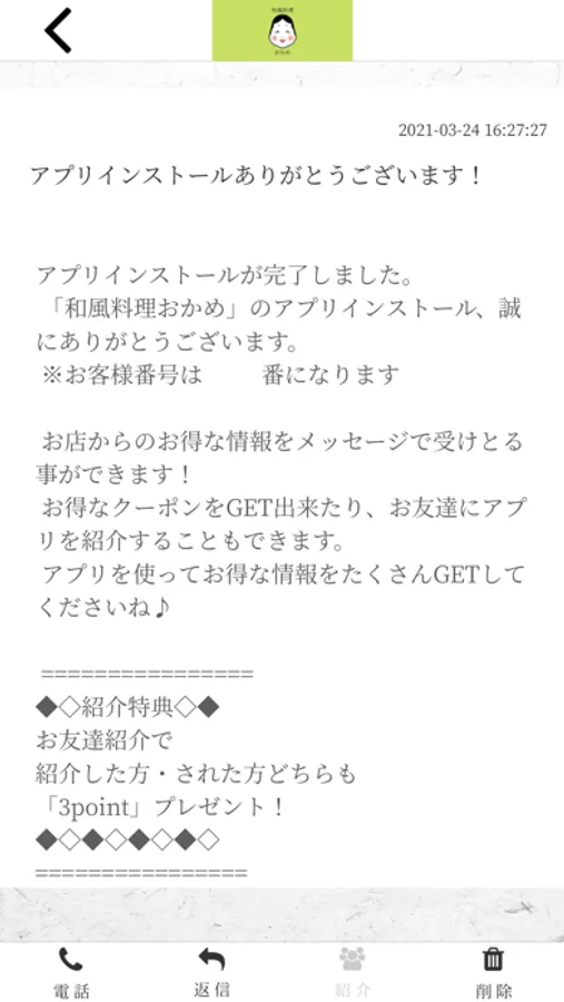 おかめのアプリをSNSを通じてお友達に紹介する事ができます。