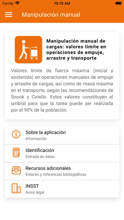 Los estudios realizados por Snook y Ciriello permiten establecer unos valores límite recomendados para las operaciones de empuje, arrastre, transporte, levantamiento y descenso de cargas en función de distintas variables. Esta aplicación implementa los valores límites publicados por Snook y Ciriello para las operaciones de empuje, arrastre y transporte de cargas de forma que la tarea pueda ser realizada por el 90% de la población.