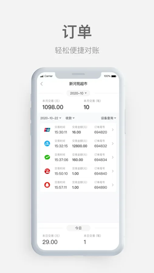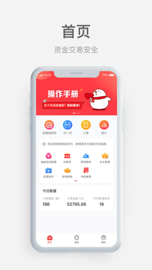 家银易支付是一款为小微商户提供聚合收款的应用。通过家银易支付App商户可以接收交易语音实时播报、查看每日收款,同时商户可以营销,发送各种优惠券,提升消费用户活跃度,增长消费。