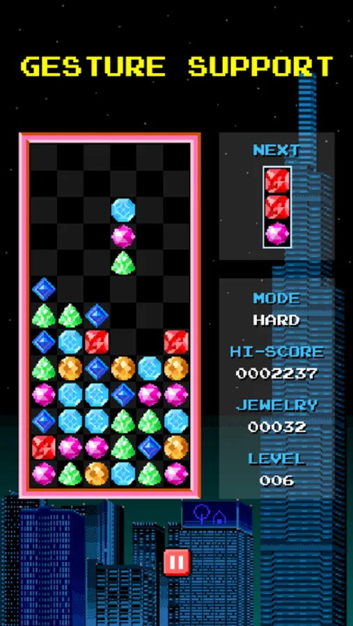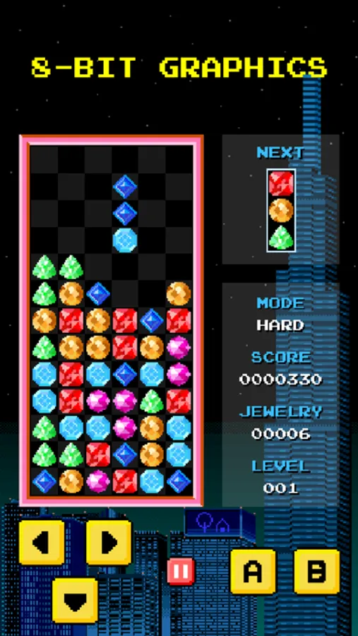Jewelry Columns is a classic game that has a falling group of 3 jewelries from top of the screen and calls as a column. The column can only be moved left or right when it's falling. The column falls until it reaches landed jewelries or the bottom of the screen. When 3 or more jewelries of the same type line up to each other (horizontally, vertically, or diagonally line), the group of jewelries will be cleared.