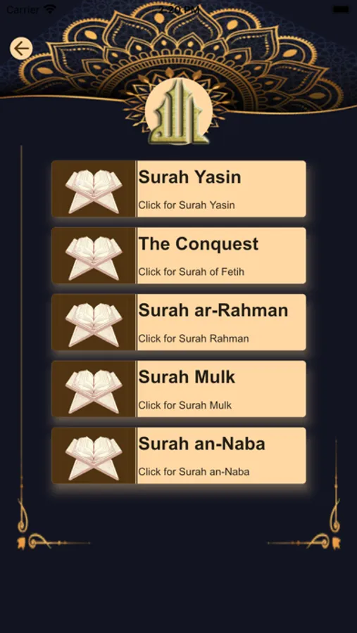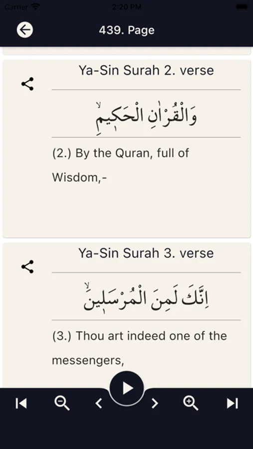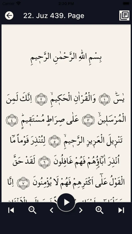 In our application where you can find the heart of our holy book, the heart of the Quran, Surah Yasin, Surah Mulk (Tabareke), Surah Al-Naba (Amma), Surah Rahman and Fatah in Arabic and its translation at the same time on the same page. If it is small, you can make adjustments according to yourself by enlarging the text instantly with the zoom keys. You can listen to these chapters, which are in the Qur'an and recite frequently on special occasions, lamps and three months, or you can recite them by heart in Arabic. If you do not know Arabic, you can still memorize or read thanks to the Arabic text written in Latin letters. You can also see what the meanings of the chapters you read with the declaration originating from the Religious Affairs. In addition, you can take the readings in our application back and forth with the back and forth keys, and you can make them play repeatedly using the repeat button. Using the time bar, you can start it from any point you want and bring it to the verse you want. On the verse reading page, you can read the meaning in Arabic script, and share the verses as a message with the Share button.