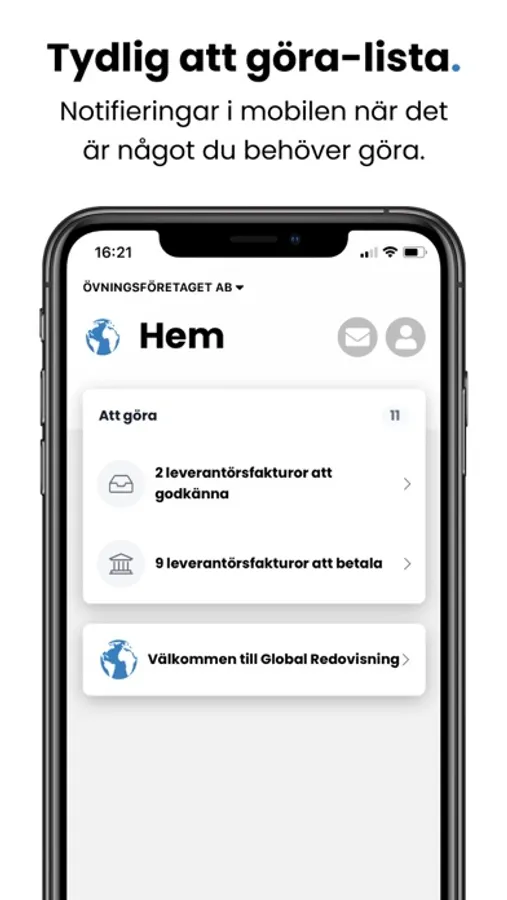 Med Global Redovisning-appen får du pushnotiser och aviseringar från oss om viktiga saker du behöver göra eller känna till. Du kan skapa, skicka och följa upp dina kundfakturor. Du kan godkänna och betala dina leverantörsfakturor direkt i appen. Du kan också fota och skicka in kvitton och andra underlag.