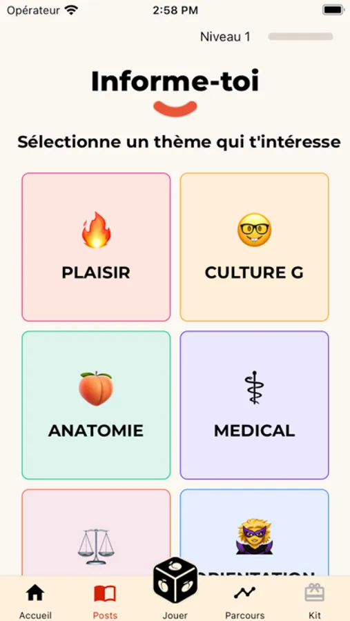 L’application te propose plusieurs thématiques à découvrir comme celle du plaisir, de l’orientation sexuelle, de l’identité de genre etc.