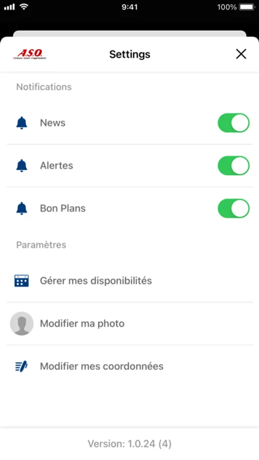 * Settings: notification and availability management.