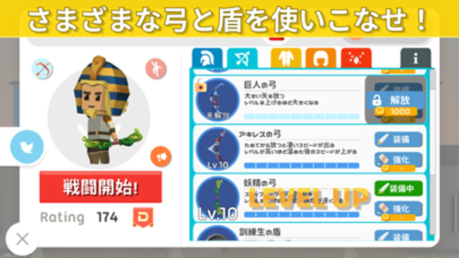 When you reach a certain rank, you will be able to select a "shield soldier" with a shield in addition to the main soldier type "archer" who shoots a bow.