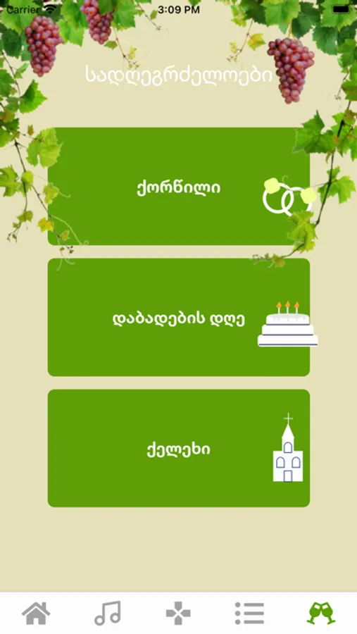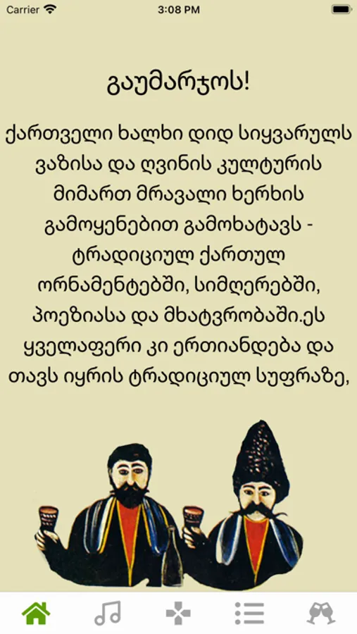 This app is designed for people who like having a good time, you can set reminder for your toasts and listen to Georgian drinking music.