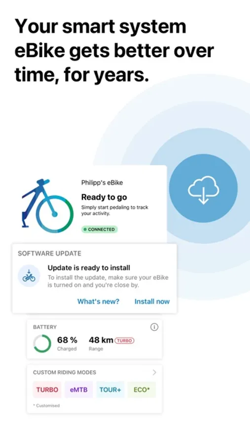With the app, your eBike is always up to date and benefits from updates and improvements as they are made available. You can easily download new eBike functions and updates for components such as the battery or motor and transfer them to your eBike via Bluetooth.