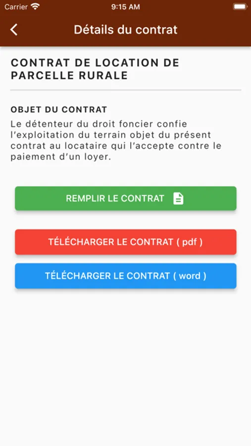 Contra’Terre permet de télécharger le modèle de contrat que vous choisirez et/ou de le remplir directement à partir de l’application. Si vous choisissez de le compléter à partir de l’application Contra’Terre, vous bénéficierez de conseils pour faciliter votre compréhension. En plus de ces conseils, vous avez une rubrique questions/réponses qui vous permet aussi de faciliter votre compréhension.