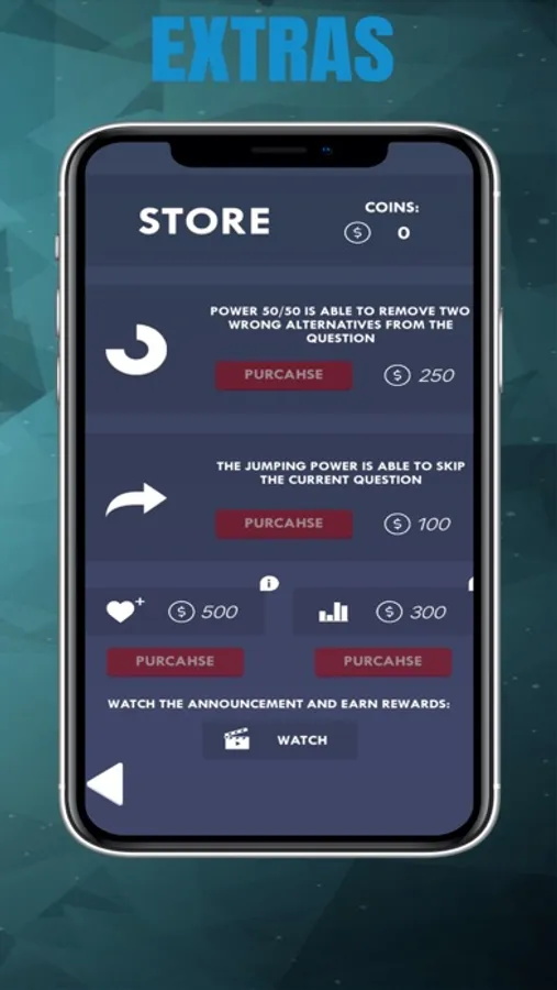 Each round you have 5 lives, you receive coins for each question answered correctly. If you give a wrong answer - minus 1 live.