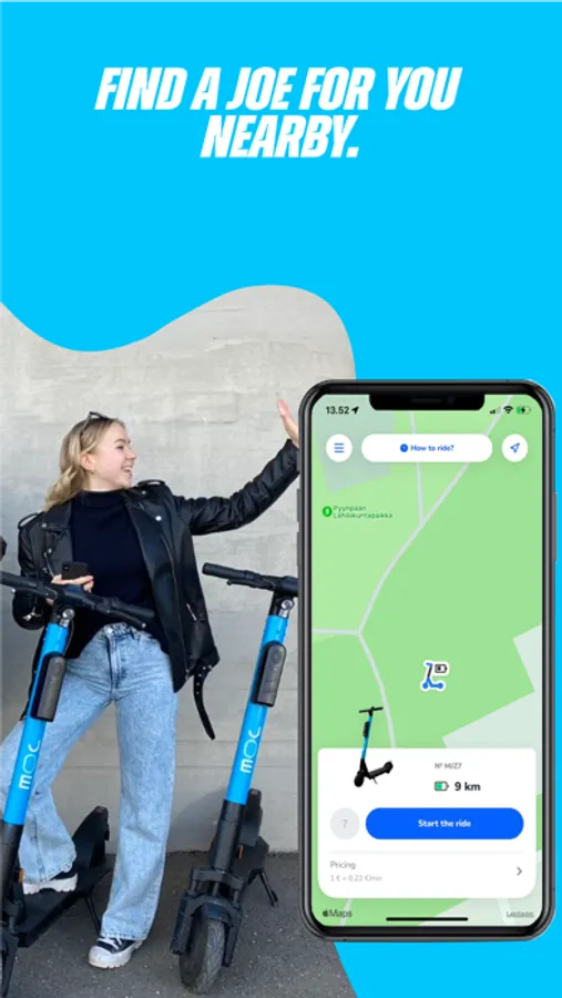 Get the Joe scooter app, find a Joe scooter and start riding.