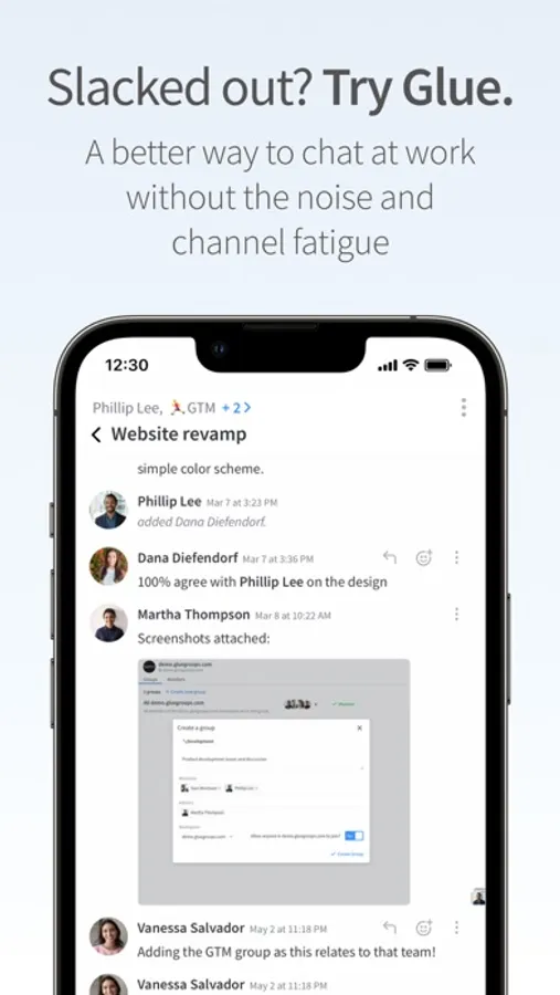 Glue is a better way to chat at work without the noise and channel fatigue. You can start chatting immediately or create topical threads with one or more users and groups to keep conversations focused. One inbox across all of your groups and workspaces gives you a single place to check. Glue can help scale your team's communication without the constraints and noise of channels. Slacked out? Try Glue.
