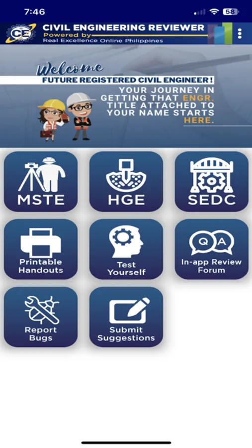 This app is a Learning Management System intended to help the user tackle all the subjects of the Philippine Civil Engineering Licensure Examination. The primary objective of the app is to enhance the knowledge and technical proficiency of the user needed to pass the licensure examinations. It is desired to equip the user the required competencies for a lifelong career in Engineering. Moreover, it also caters to the needs of students enrolled in civil engineering course.