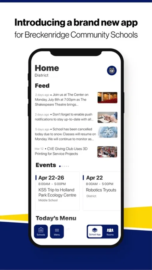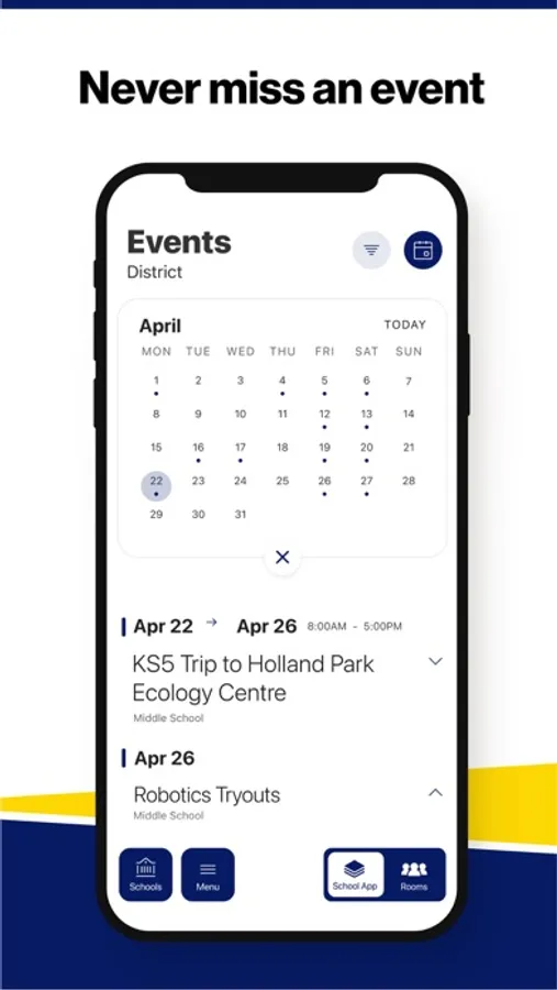 The event section shows a list of events throughout the district. Users can add an event to your calendar to share the event with friends and family with one tap.