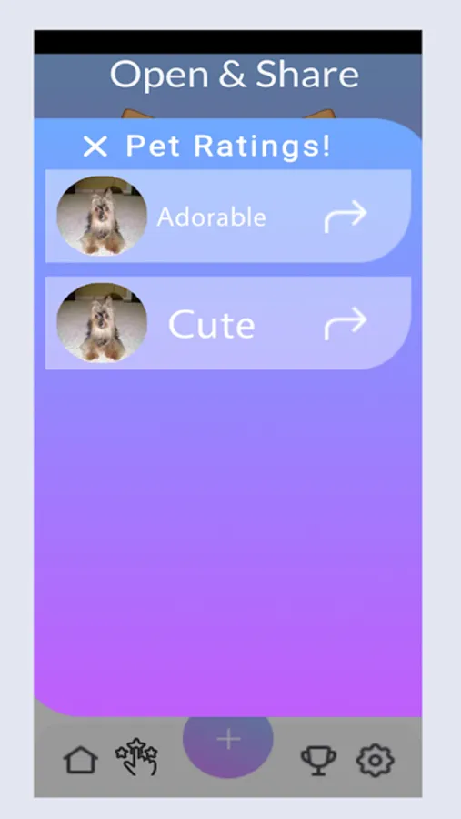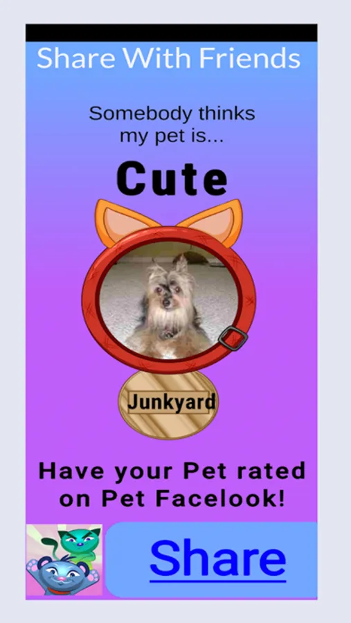 You can easily share your pet ratings by clicking the share button which will take you to a list for all of the apps on your phone i.e. Gmail, Outlook, Facebook, TikTok, Instagram, Messenger, etc.