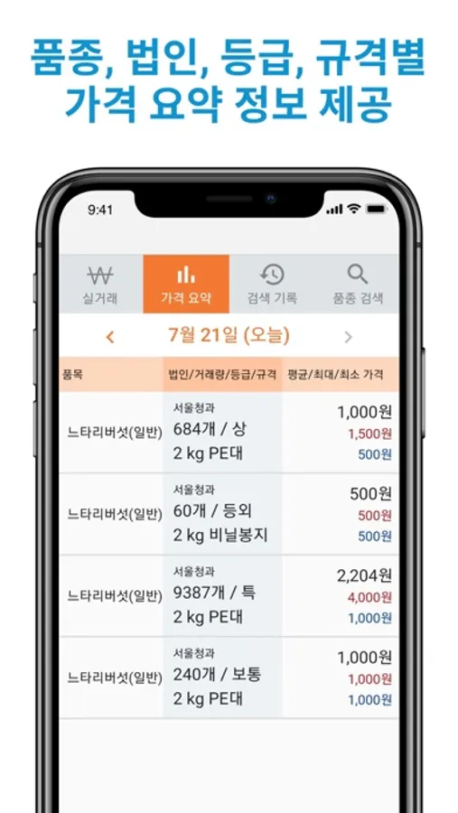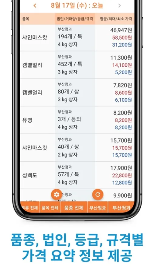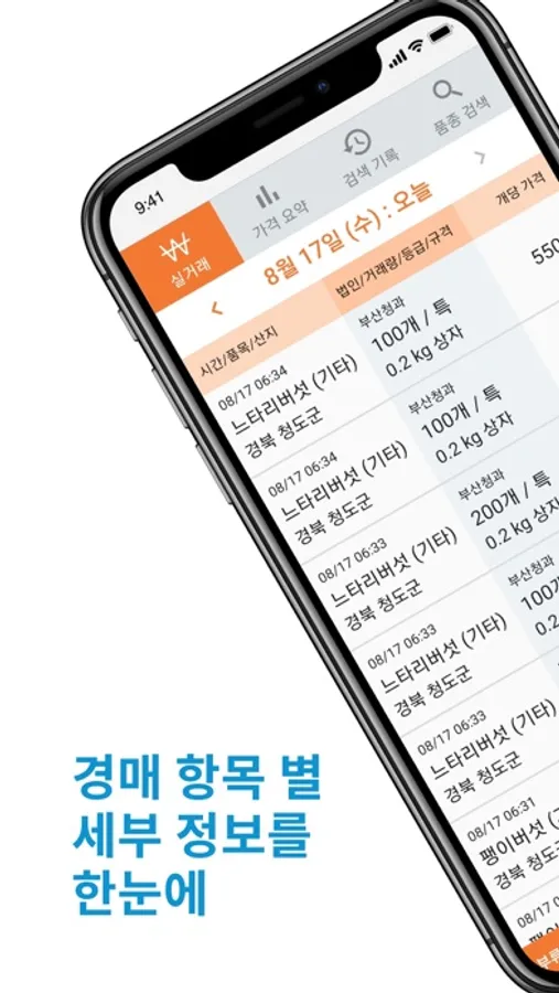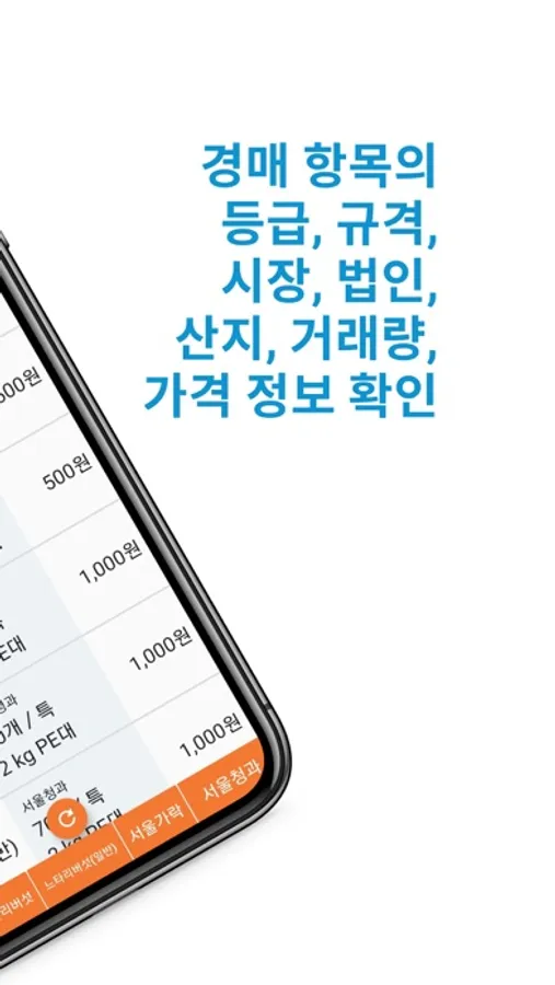 - 경매항목의 등급, 규격, 시장, 법인, 산지, 거래량 및 가격 정보 확인이 가능합니다.