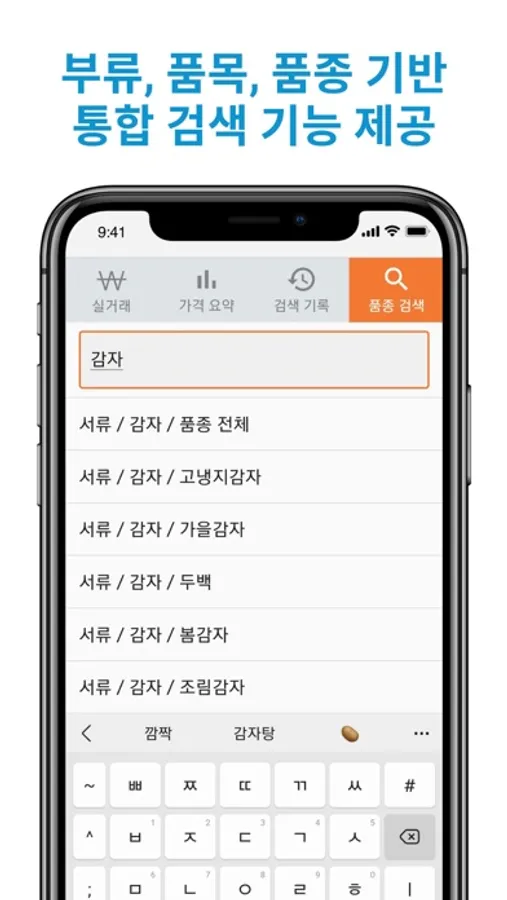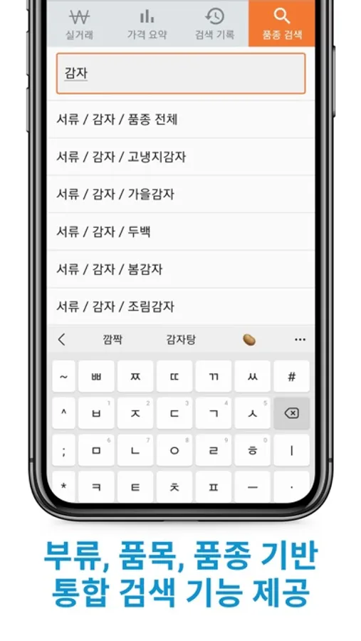- 부류, 품목, 품종을 통합 검색하여 실거래 검색 조건을 설정할 수 있습니다.