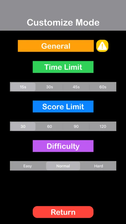 Customize the ruleset by changing the category, time limit, score limit if playing score mode, and difficulty if playing alone.