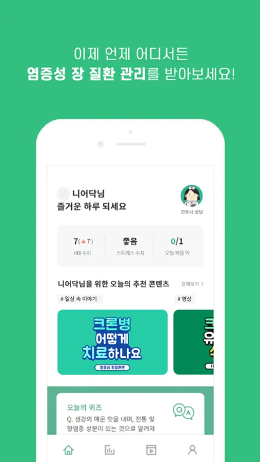 평생 증상을 조절하고 관리해야 하는 질환인 만큼 염증성 장질환 관리 앱 니어닥과 함께 쉽고 편리하게 증상과 삶의 질 관리를 함께해보세요.