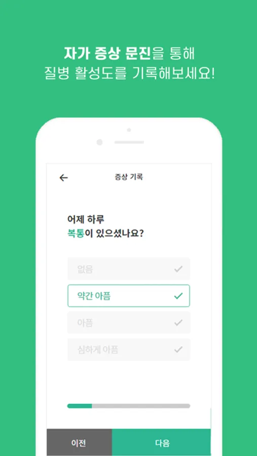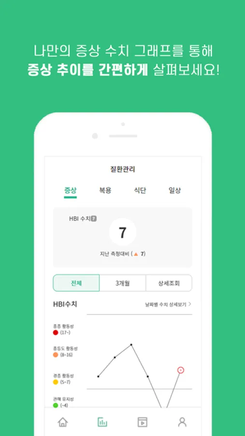- 스트레스 체크를 할 수 있으며, 병원 검사 기록이 필요없는 자가 증상 문진(HBI/SCCAI)을 통해 질병활성도를 기록하여 보고서를 생성하고 증상추이를 쉽고 간편하게 살펴볼 수 있습니다.