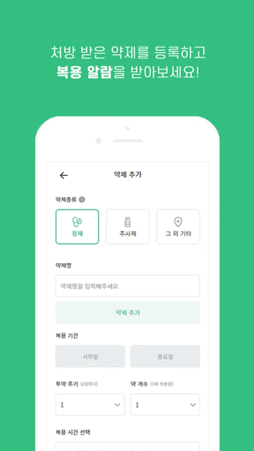- 처방 받은 약제를 등록하고 복용 스케줄을 관리하며, 설정한 시간에 맞춰 복용 알람을 받을 수 있습니다.