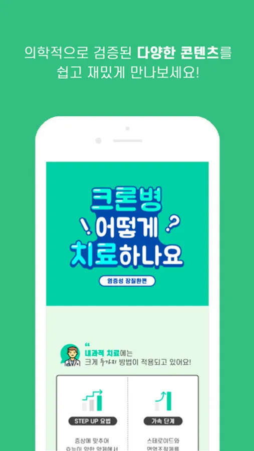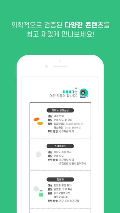 - 의학적으로 검증된 다양한 콘텐츠를 제공하여 염증성 장질환을 좀 더 쉽고 재미있게 이해할 수 있도록 돕습니다.