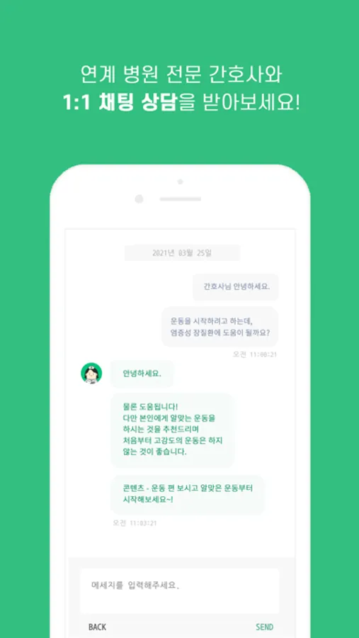 - 연계병원의 전문간호사와 질환 및 건강상태와 관련한 채팅상담을 진행할 수 있습니다.