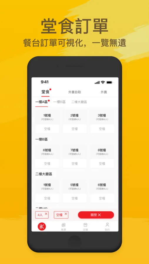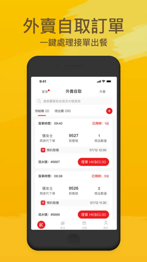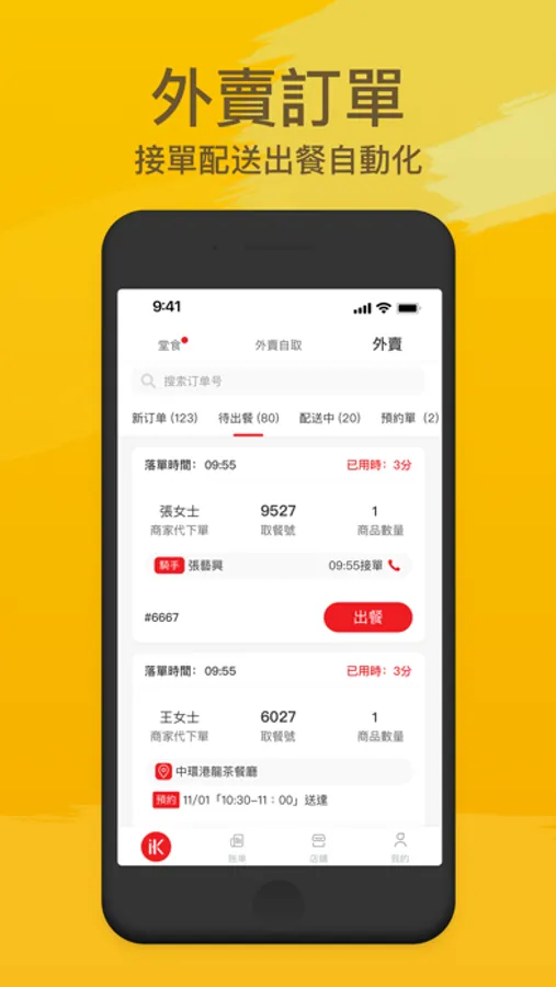 堂食與外賣的訂單分開處理,確認客戶取餐狀態。